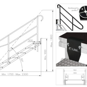 HANDRAIL: The staircase includes a set of handrails (Ref. PSA-05) made of Ø 35 mm tube with internal cross-shaped reinforcement, made of high-strength aluminium and finished in black powder paint. Its design with two horizontal bars guarantees greater safety for the users. The handrails are supplied with six connectors to attach them to the staircase structure, including an inner plate to avoid marking the rails and to make them last longer.