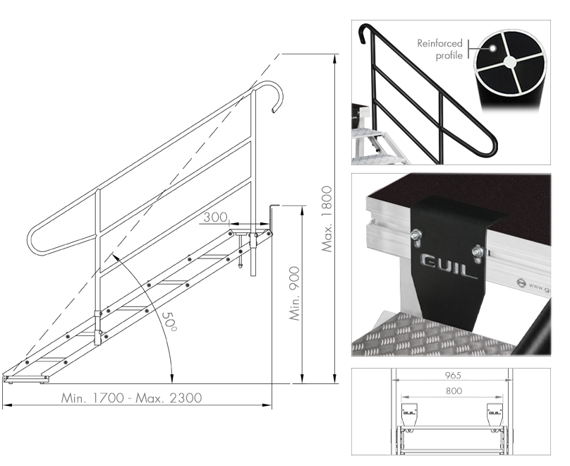 QUICK & EASY SET-UP: The same staircase can be used for stages from 900mm to 1800mm in height, simply by adjusting the inclination of the steps and regulating them with the fixing system.