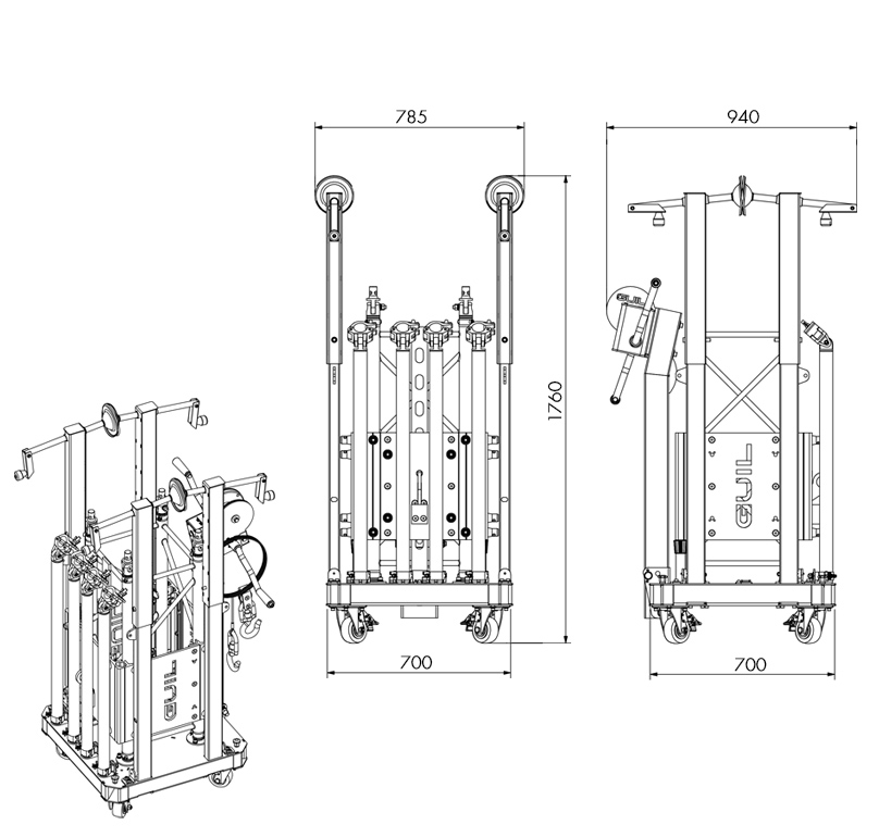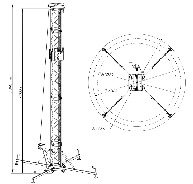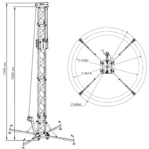 Ground Support tower to lift loads of up to 500 kg (1,100 lb) to a maximum height of 7.39 m (24 ft 3 in) and a work height of 7 m (23 ft). Tower structure composed of 400 x 400 x 3 mm (15.75 in x 15.75 in) reinforced square truss sections and sleeve block. Double-handled BULL500 winch. Designed and manufactured for both indoor and outdoor use.