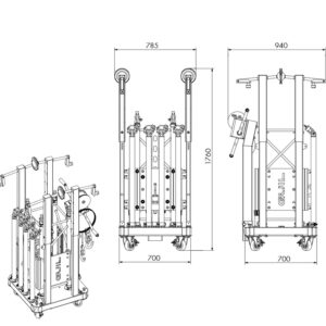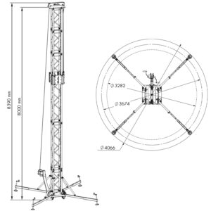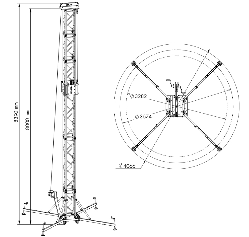 Ground Support tower to lift loads of up to 500 kg (1,100 lb) to a maximum height of 8.39 m (27 ft 6 in) and a work height of 8 m (26 ft 3 in). Tower structure composed of 400 x 400 x 3 mm (15.75 in x 15.75 in) reinforced square truss sections and sleeve block. Double-handled BULL500 winch. Designed and manufactured for both indoor and outdoor use.