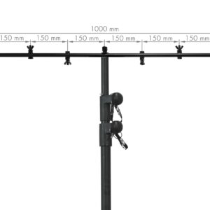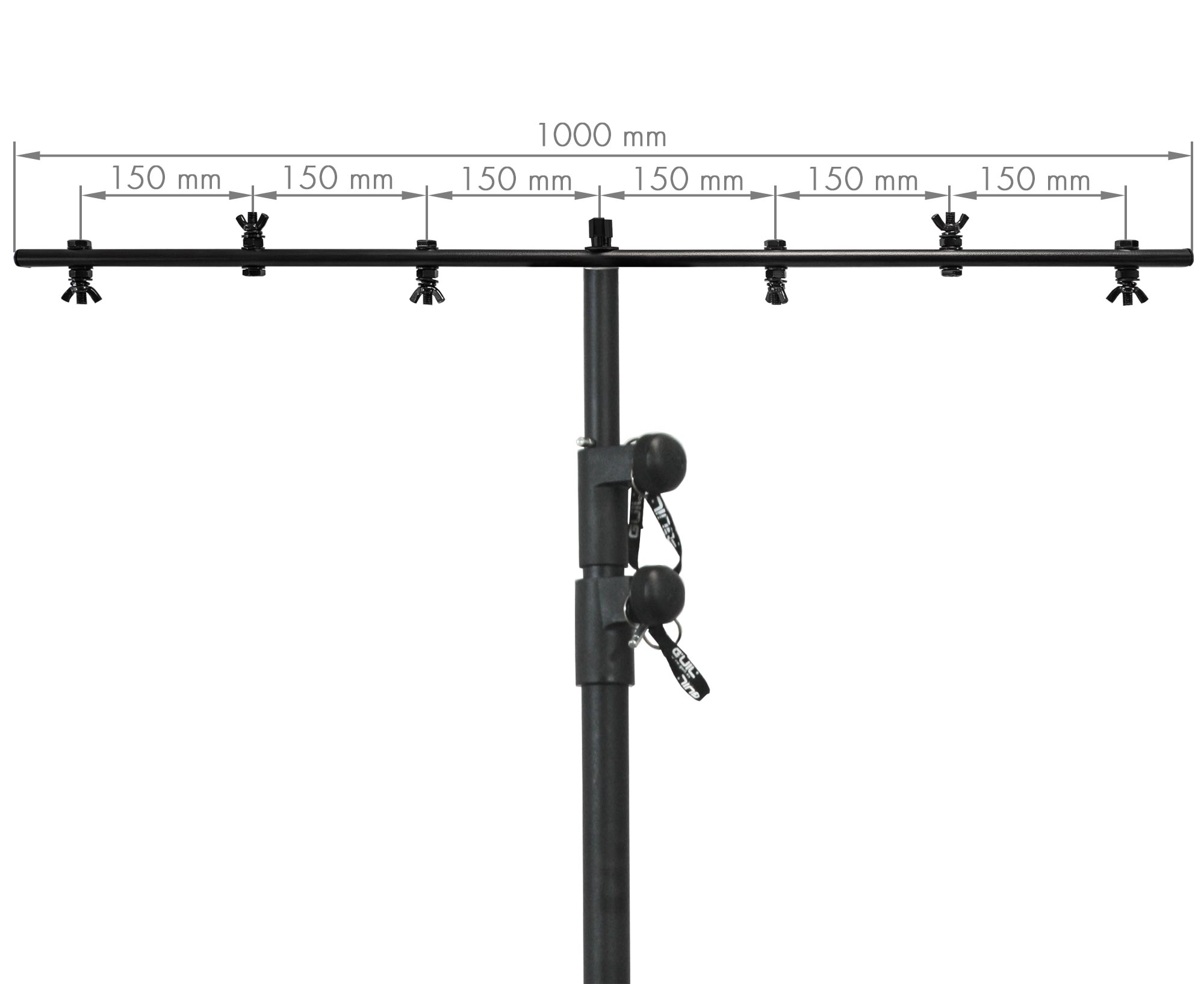 Manual lighting stand with crossbar for 2 to 6 spotlights, using the top and bottom parts of the crossbar. The stand includes the TF-07 tripod and a detachable steel crossbar, allowing the tower to be used for a single spotlight. Includes nuts and bolts to attach the spotlights.