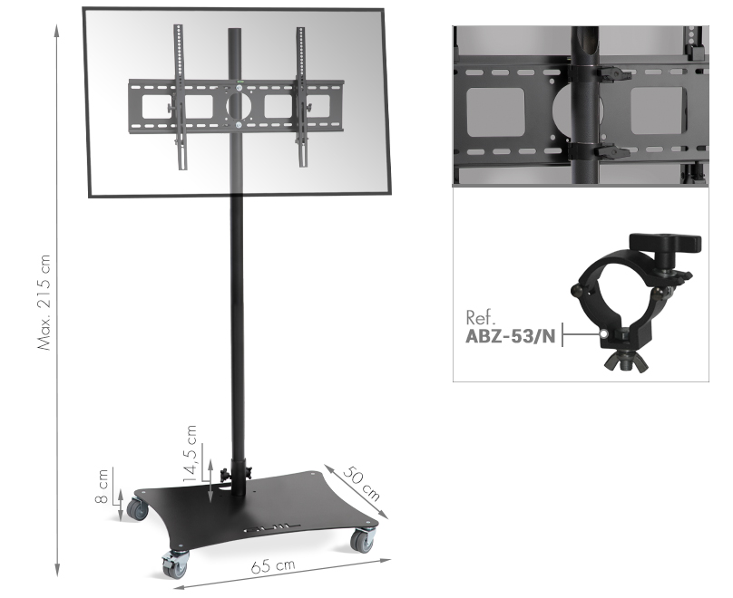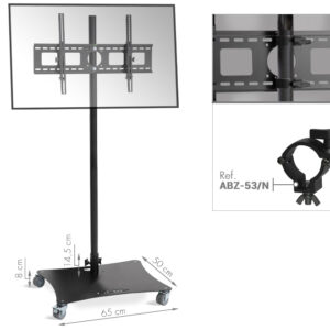 Professional mobile stand to display TV screens from 32 to 55 inches with a maximum weight of 40 Kg. Fits any screen with VESA standard hole size: max 800 x 500 mm.