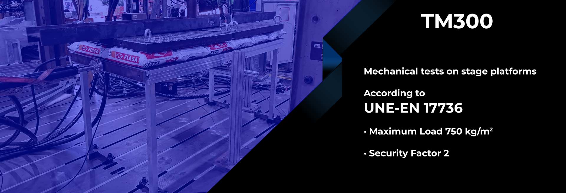 To meet these standards a 2 safety factor is required. The load and safety tests for the TM300 (2×1) GUIL platform were carried out with 3000 kg.