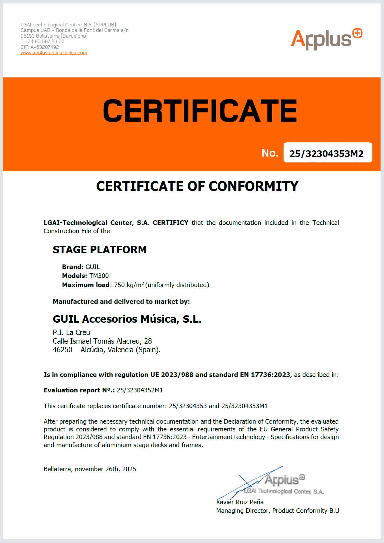 Our TM300 platforms are certified for a load capacity of 750 kg/m2 by the external certifying company APPLUS (certificate Nº 25/32304353M2) to comply with the following safety norms: