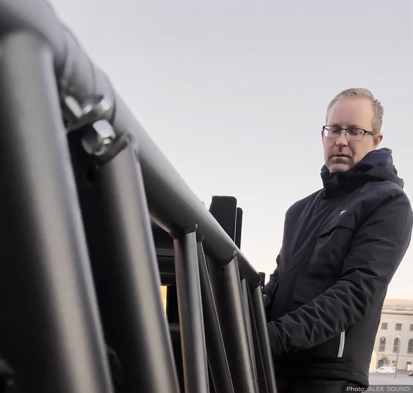 In addition to lifting the sound apparatus and raising the aluminium structure to its vertical position, the chain of the motor also acts as an auxiliary strut, giving the tower great solidity and resistance. NOTE: We recommend using a motor with the following specifications: Load capacity: 1000 kg I Chain length: 18 metres