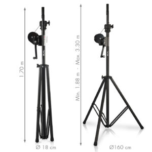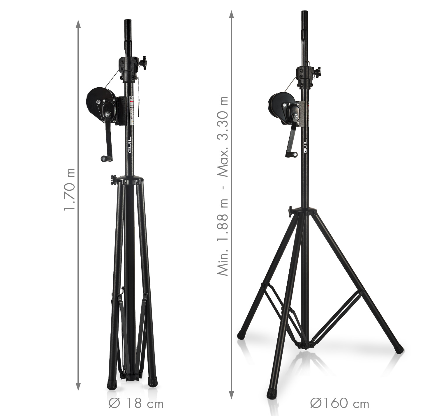 Compact telescopic lift for spotlights, specially designed for easy transportation when folded. It has been certified to lift loads of up to 85 kg to a maximum height of 3.30 metres and has a Ø 35 mm top shaft.