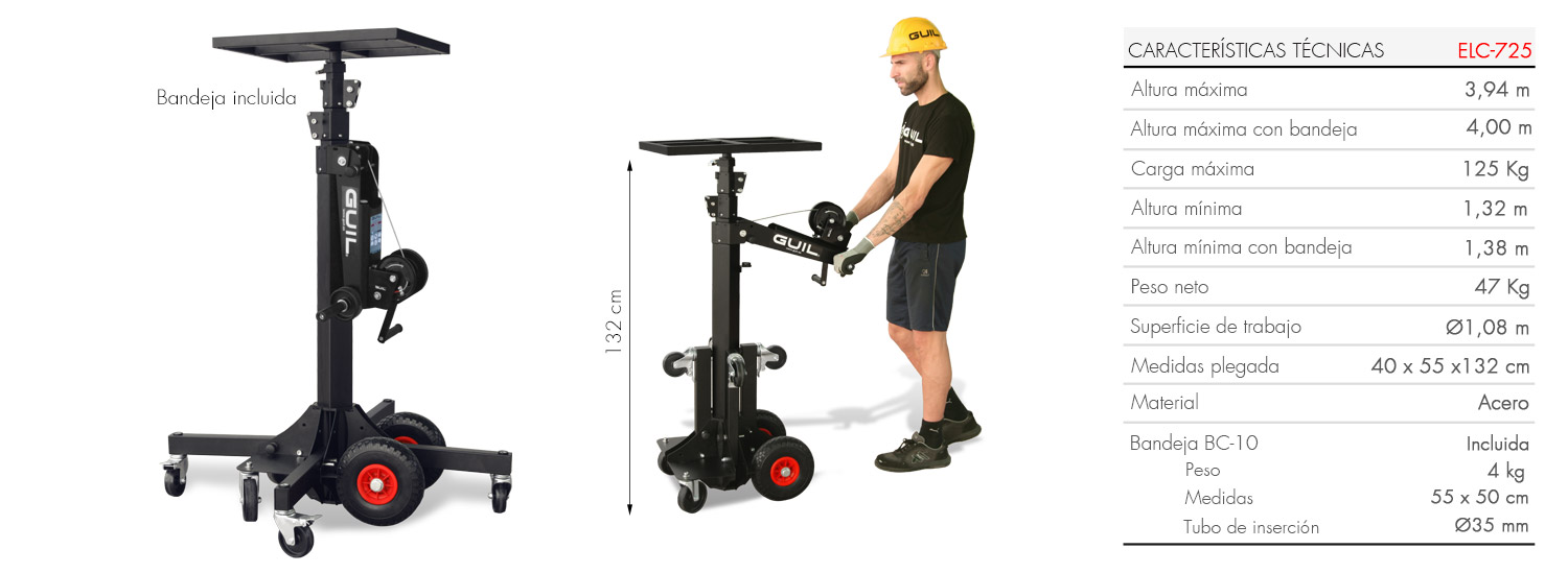 | ELC-725 | 4.00 m | 125 Kg | 1.32 m | 50 Kg | Metros/Kilogramos |