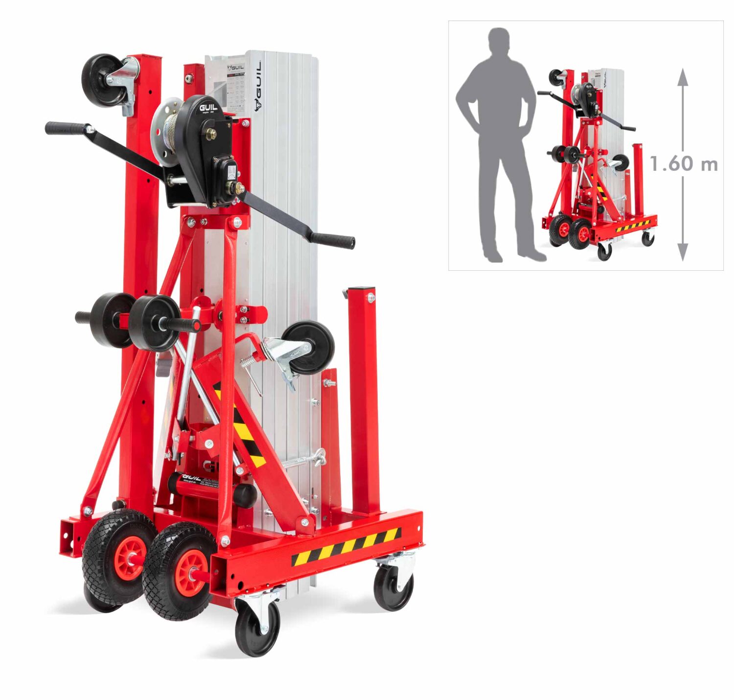 The lifter is equipped with an automatic brake winch with two handles, which stops and holds the load at the desired height; when the handles are released the automatic brake holds the load in place.