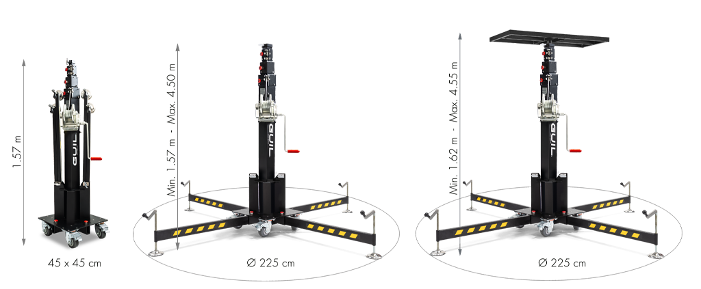 Altura Máxima: 11 ft 6 in| 3,50 m Altura Plegada: 1,35 m| 4 ft 5 in Carga Máxima: 125 Kg| 276 lb Peso Neto: 25 Kg| 55 lb -