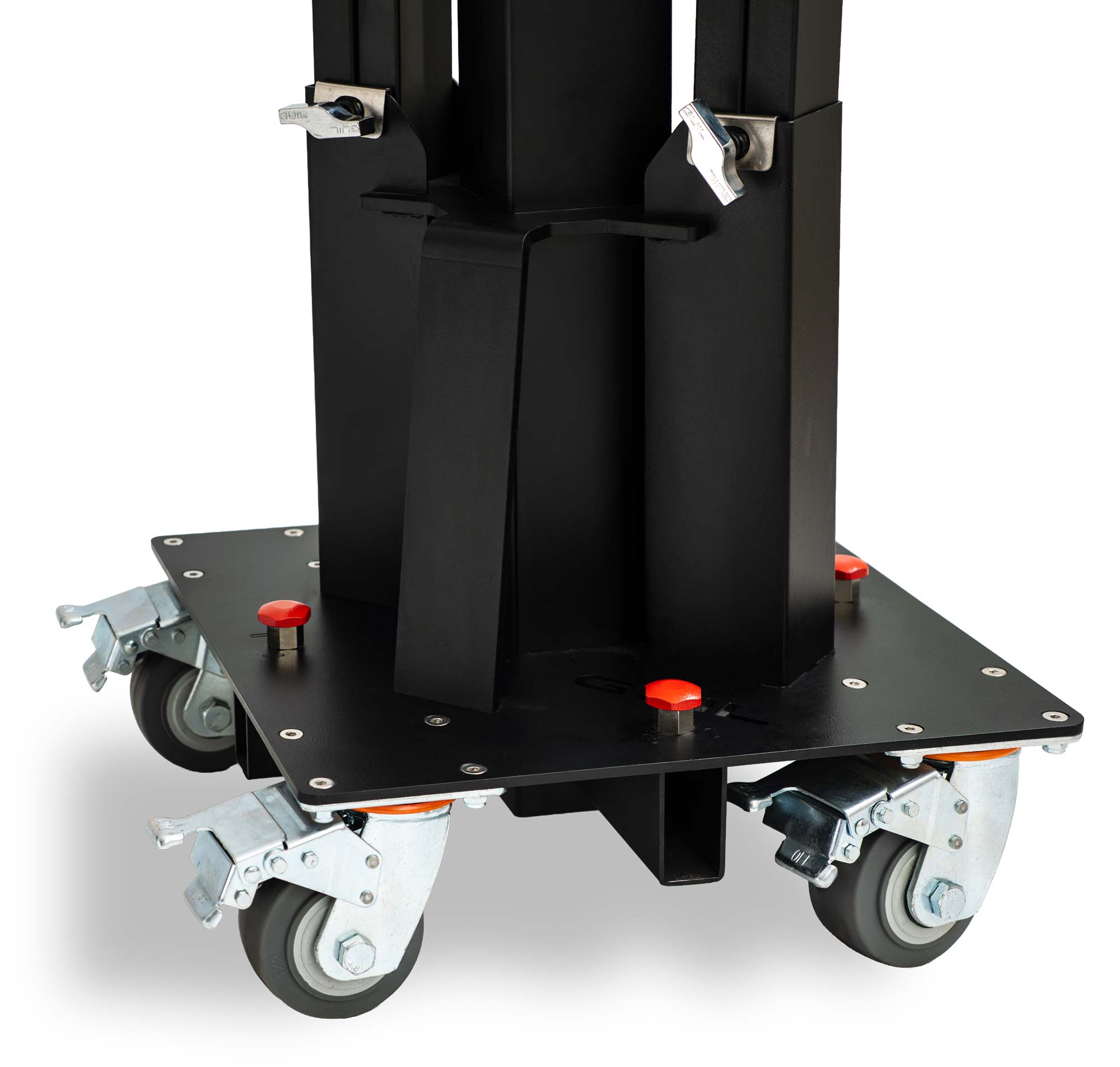 La torre está provista de cuatro ruedas giratorias de gran resistencia para facilitar su manejo y transporte. Las ruedas están fijadas a la base mediante chapa de acero, con cuatro tornillos por rueda; de esta manera se garantiza máxima fijación incluso en trabajos donde se requiera mover la torre por suelos irregulares.
