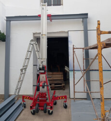 Elevador equipado con 2 perfiles fabricados en aluminio de alta resistencia, extensibles mediante juegos sobredimensionados de poleas con rodamientos y cable de acero galvanizado de gran resistencia y flexibilidad (especialmente diseñado para la elevación de cargas).