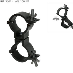 Abrazadera de aluminio doble giratoria (360º) para cargas de hasta 100 kg. Diseñada para una fijación segura a trusses / tubos con diámetro externo de 48 mm a 51 mm.