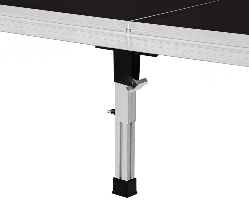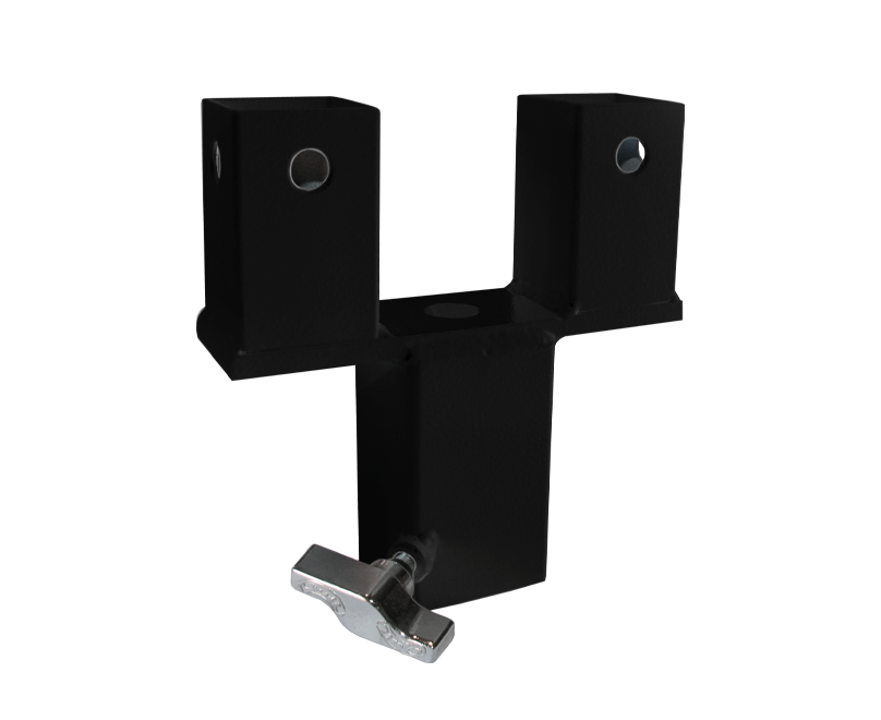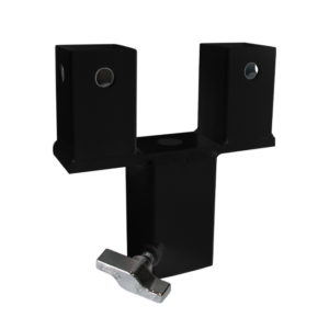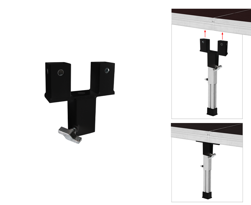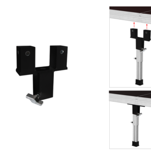Práctico adaptador para unir dos tarimas, utilizando una sola pata. El conector RD/5 es una opción ideal para una mayor rapidez en el montaje del escenario, consiguiendo en el espacio de 2 patas, montar solo una.
