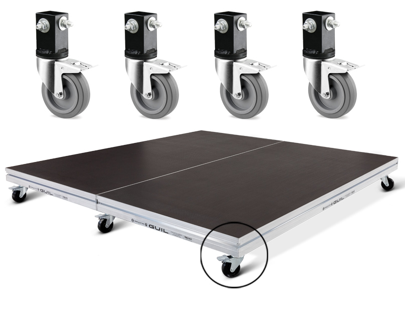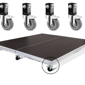 Juego compuesto por cuatro adaptadores reforzados de acero provistos de ruedas de nylon giratorias con freno (Ø 100 mm) para adaptar a las tarimas TM440, TM300 y TM440XL.