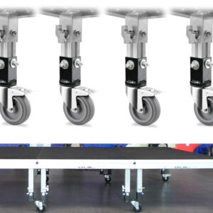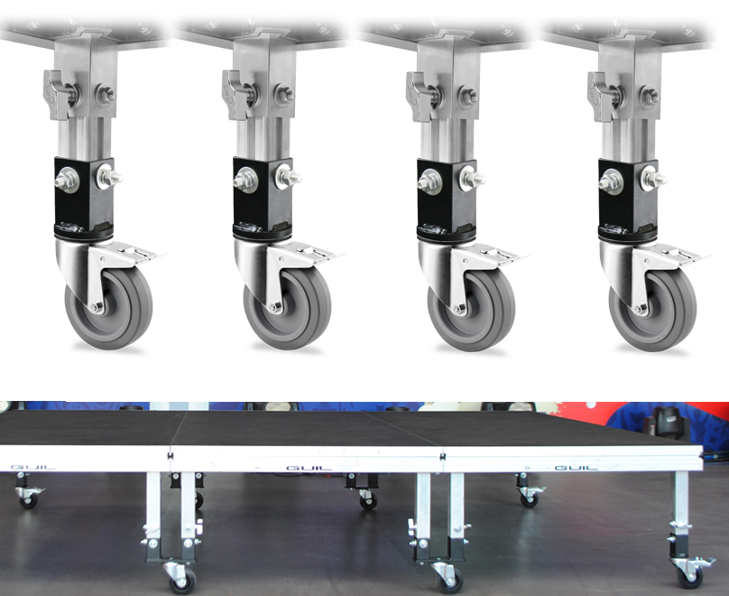Sustituyendo el juego de patas de la tarima por este práctico juego de patas con ruedas, convertimos la tarima en un cómodo carro de transporte, un escenario móvil o una tarima para baterías, etc.