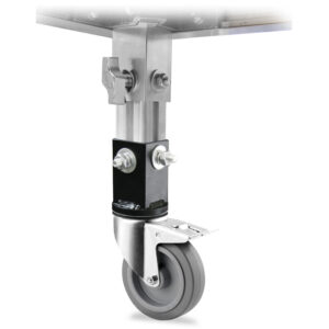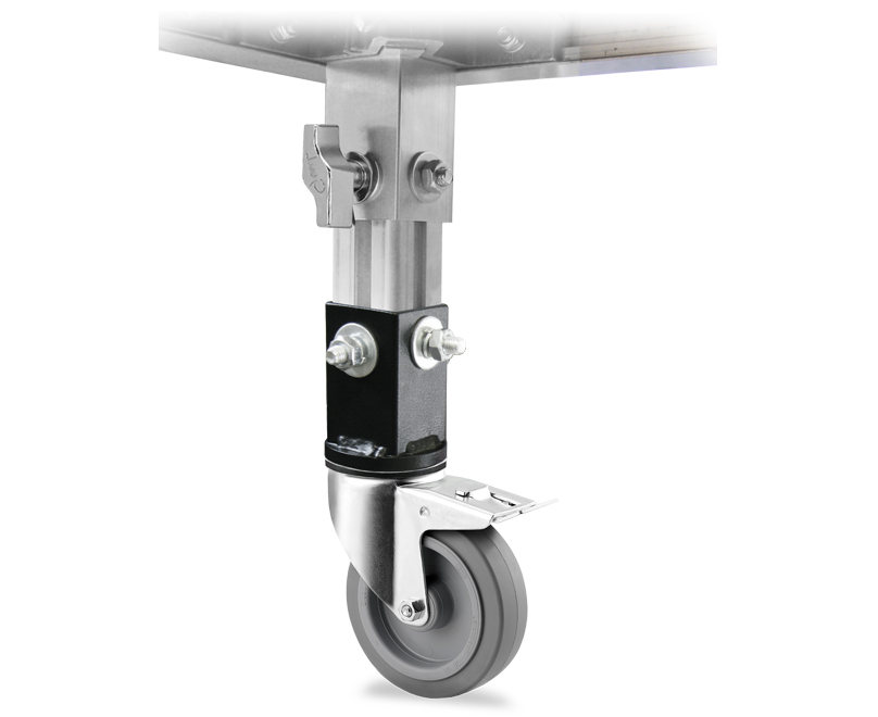 Juego compuesto por cuatro patas telescópicas de 60 x 60 mm con casquillo de refuerzo, provistas de ruedas de nylon giratorias con freno (Ø 100 mm).