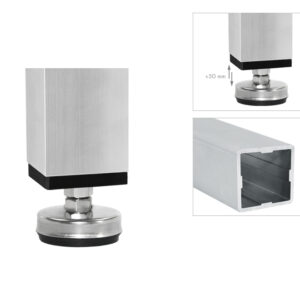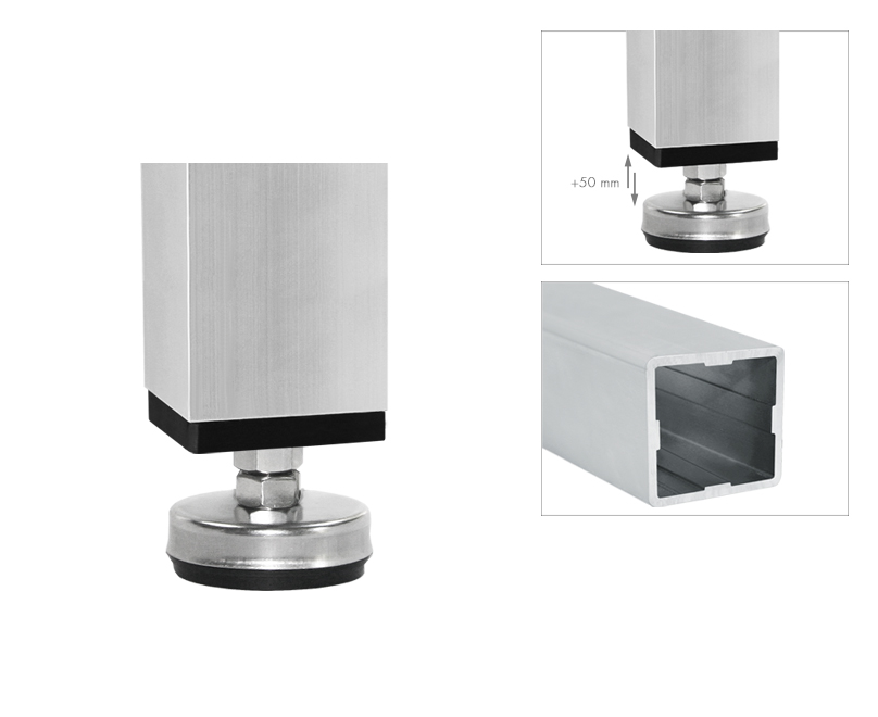 La pata está provista de un husillo fabricado en acero inoxidable y un terminal de caucho antideslizante garantizando un perfecto ajuste a todo tipo de superficies. El nivelador permite una regulación de hasta 50 mm.