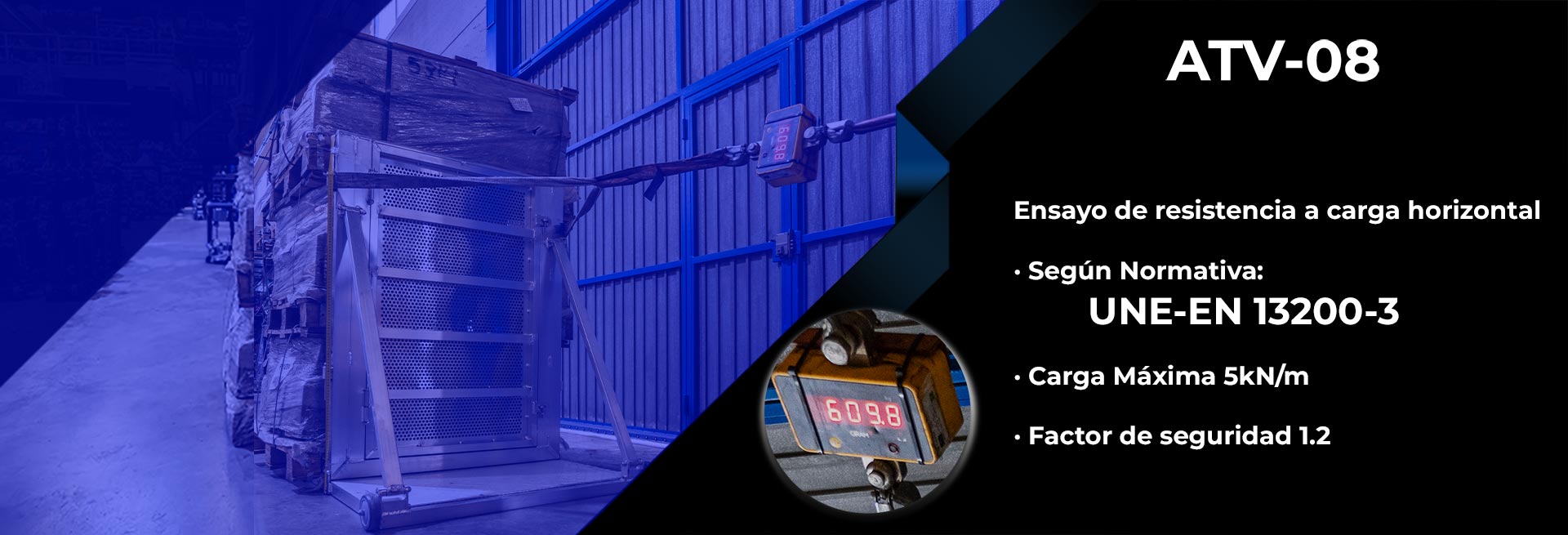 En estos casos, las barreras deben ser capaces de soportar cargas de ensayo equivalentes a 1,2 veces dicha carga, conforme al Anexo A.2 de la norma. Por ello, las barreras ATV han sido ensayadas aplicando una carga horizontal superior a: 6 kN/m, conforme a lo establecido por la normativa.