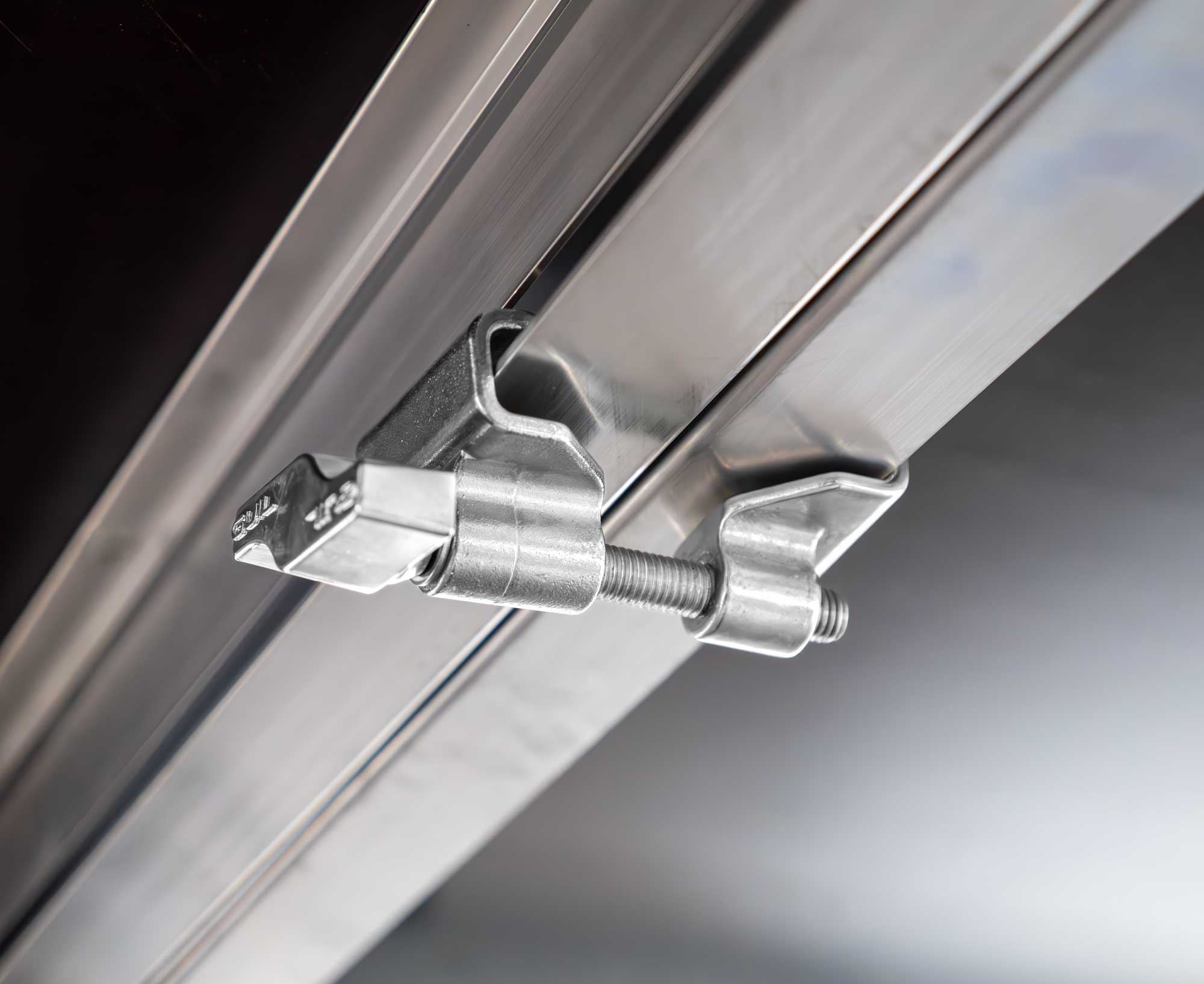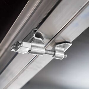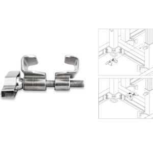 Sistema reforzado de anclaje de tarimas mediante la unión interna de sus marcos; refuerza la estabilidad de toda la estructura y previene cualquier movimiento vertical. Esta mordaza está diseñada para una fijación segura de tarimas colocadas a la misma altura.
