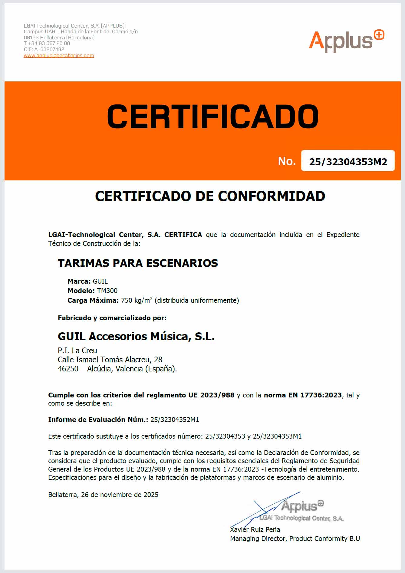 Nuestras Tarimas TM300 están certificadas para 750 kg/m2 por la empresa certificadora APPLUS (certificado Nº 25/32304353M2) bajo la siguientes Normas: