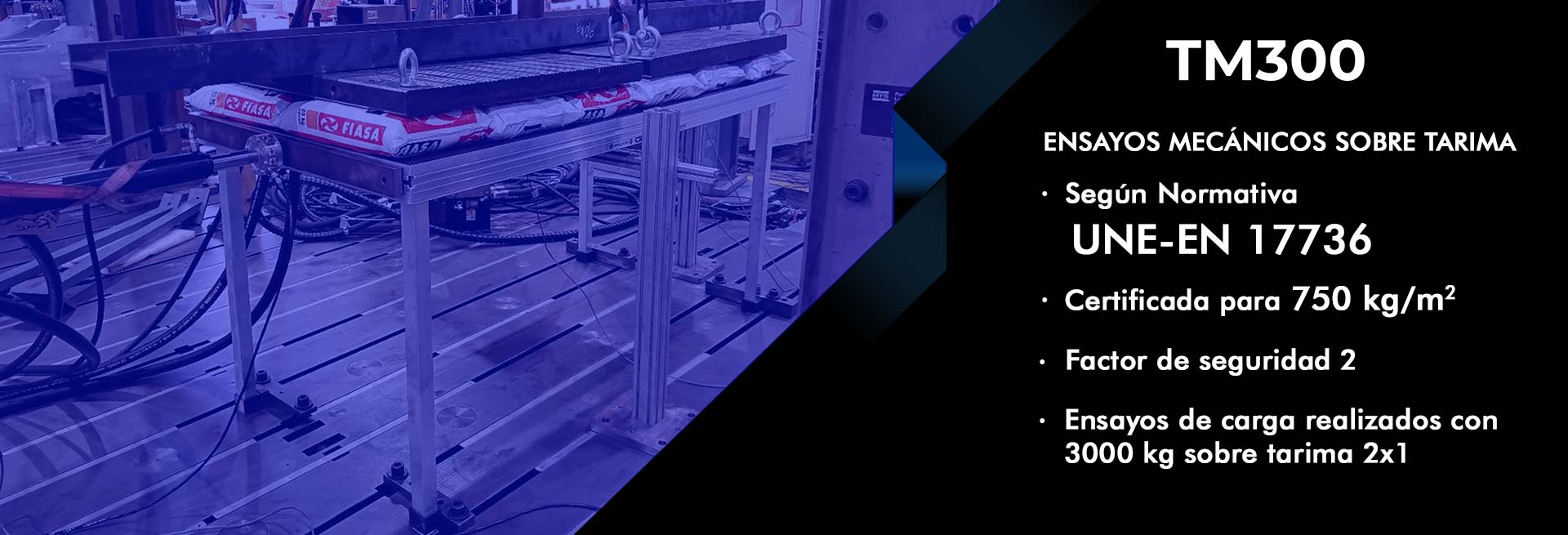 Estas normativas exigen un factor de seguridad de 2. Las pruebas de seguridad y los ensayos de carga para la tarima GUIL TM300 se realizaron con 3000 kg sobre una tarima de 2×1.